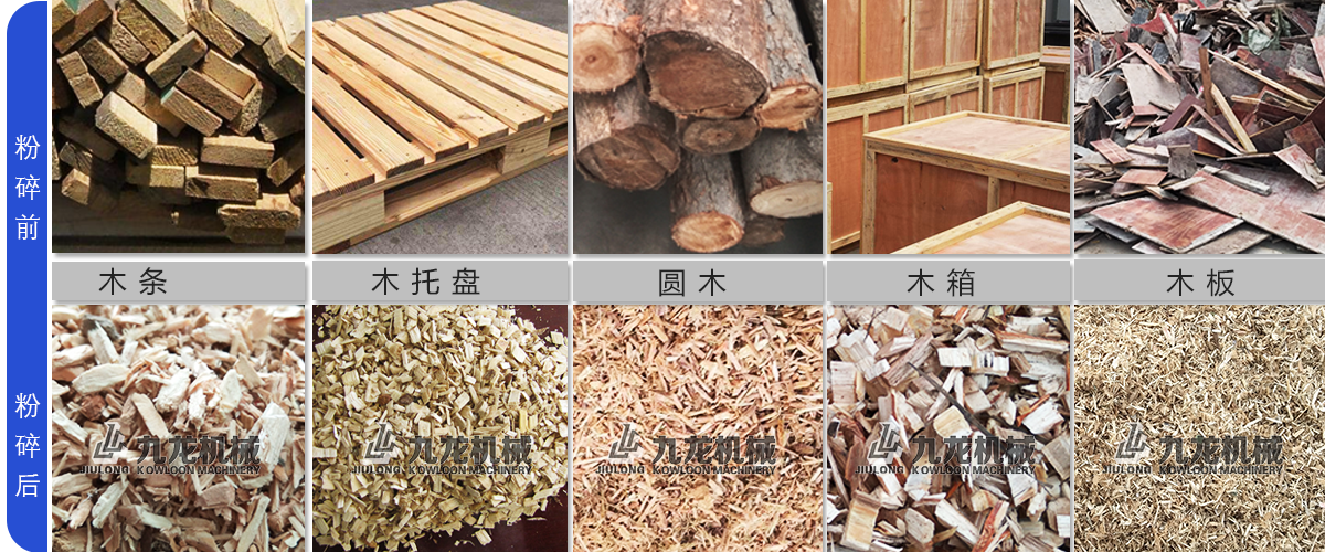 各種廢舊木材、板材料、木托盤、下腳料、舊家具、木板、木箱等?,F(xiàn)在粉碎木材和農(nóng)作物的人越來越多,木材破碎后可以應(yīng)用在電廠發(fā)電,制作香行業(yè)、能源棒的生產(chǎn)和菌菇生產(chǎn)養(yǎng)殖等等不同的領(lǐng)域。